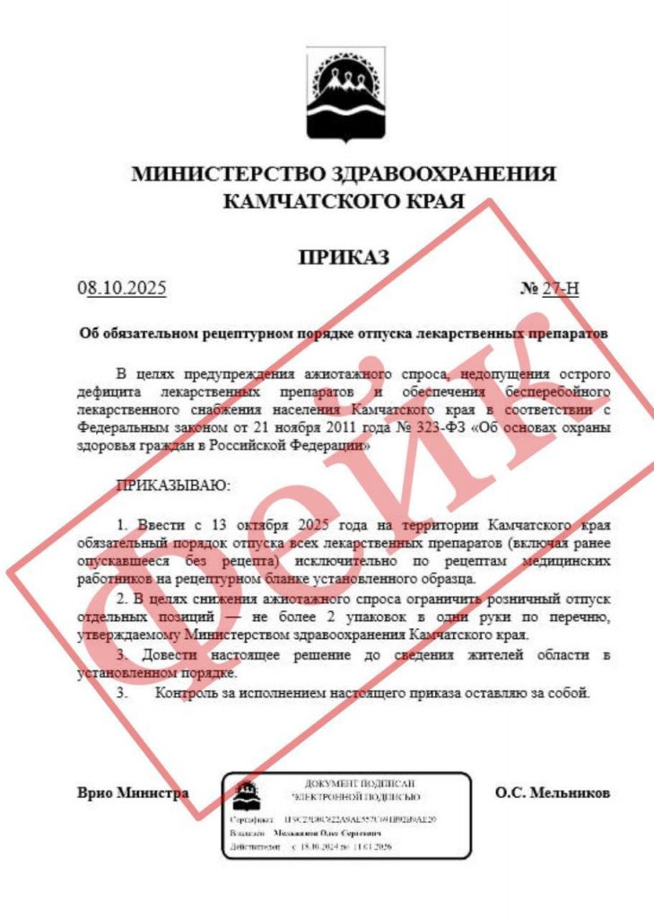 Документ, якобы подписанный врио министра Олегом Мельниковым, утверждает, что на Камчатке введены ограничения на отпуск лекарств. По данным ведомства, никаких ограничений не вводилось, и министр подобный документ не подписывал. “Данное сообщение является фейковым, и на это указывают несколько фактов: – В третьем пункте документа упоминается «область», тогда как у нас – Камчатский край. – Плохое […]